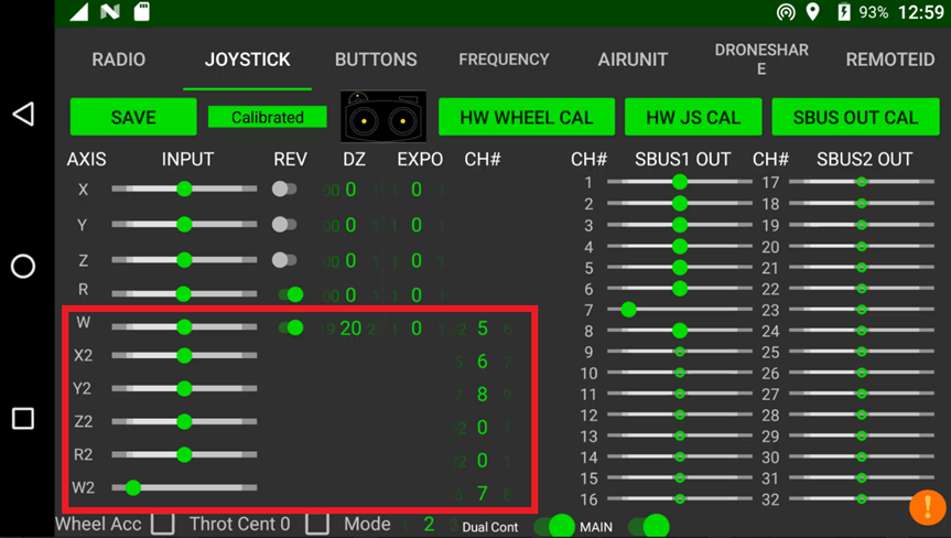 • Now go back to the master controller. Go to the Herelink settings, Joystick tab. You should be able to set the slave controller’s joystick values, set W to Ch 5, X2 to Ch 6, Y2 to Ch 8 and W2 to Ch 7. Click “SAVE”.