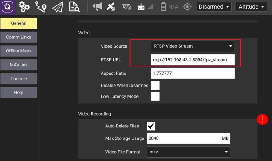 Set “Video Source” to RTSP Video Stream and “RTSP URL” to rtsp://192.168.43.1:8554/fpv_stream.