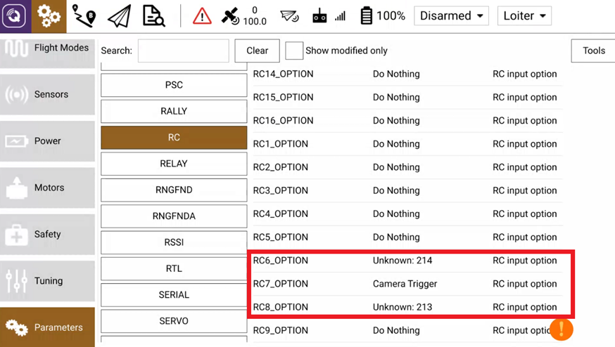 Using the master controller, open the QGC app. After the parameters have downloaded and you are connected to the X55, go into the RC section of the Parameters tab. Set the RC6_OPTION, RC7_OPTION, and RC8_OPTION as shown in this screenshot.