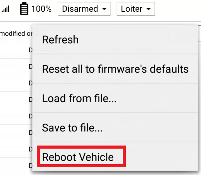 Click again on the “Tools” button and click “Reboot Vehicle”. Then, close QGC on the Herelink and re-open the application and wait for all parameters to load.