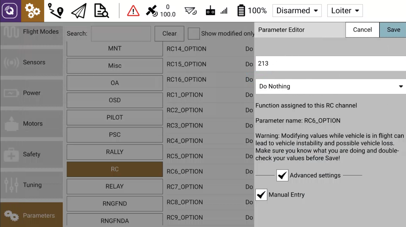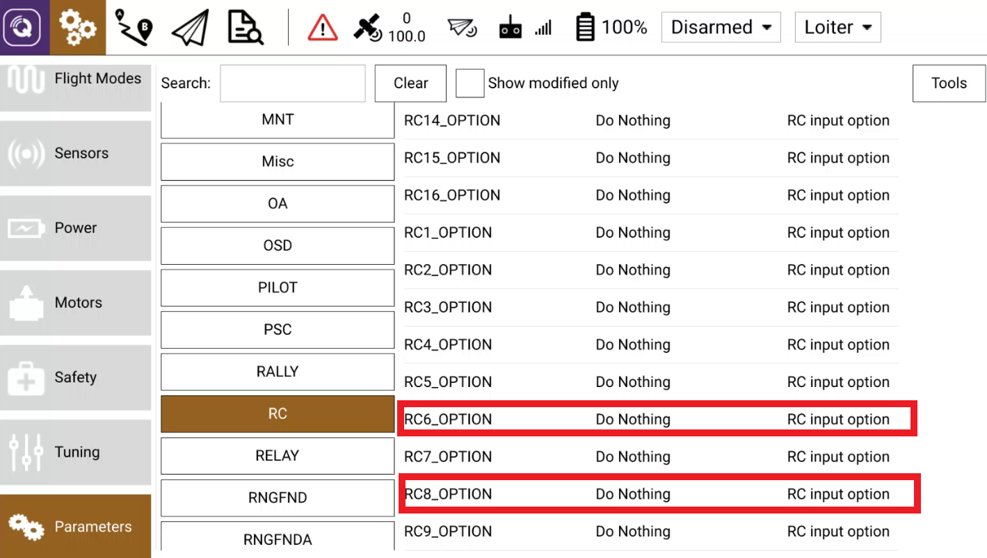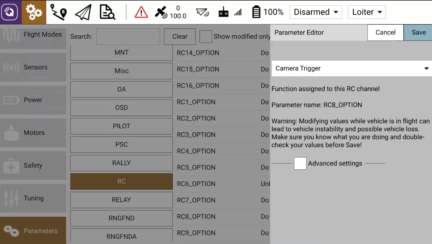 Find the “RC” category and set the RC6_OPTION to 213 and the RC8_OPTION to “Camera Trigger”. You may have to search for RC in the search bar to find these. For RC6_OPTION, you will have to manually type in 213.