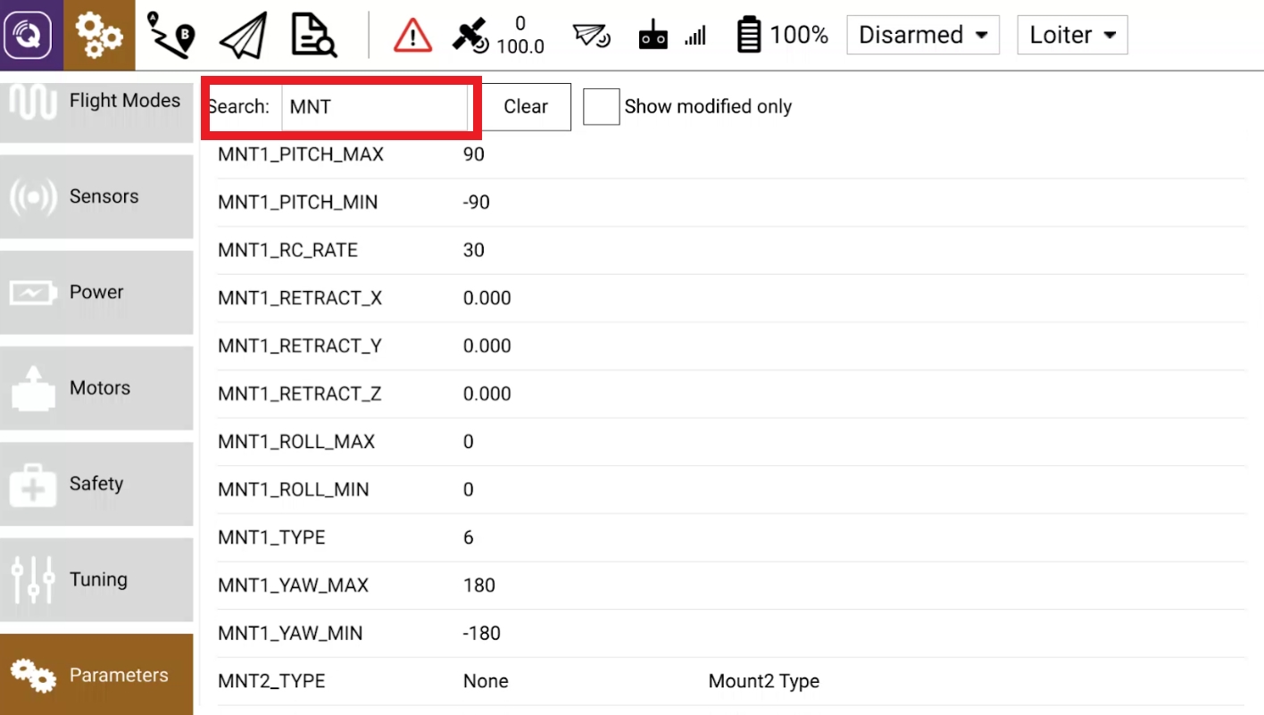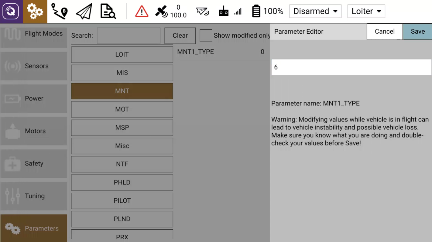 Find the MNT1_TYPE parameter, and set it to 6, then click “Save”.