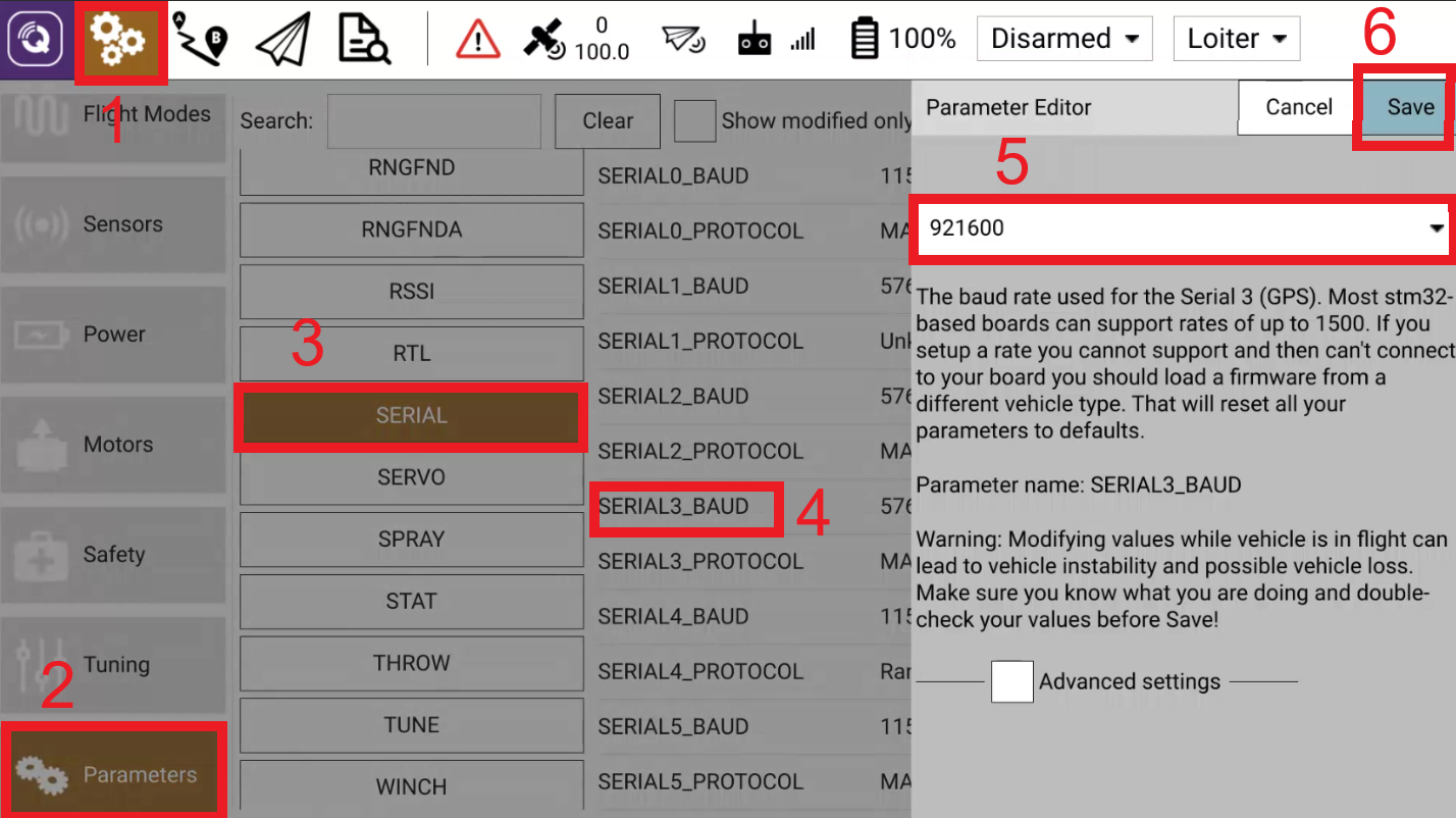 Click on the gear icon, go to the parameters tab, click on “SERIAL”, then change “SERIAL3_BAUD” to 921600 and click "SAVE". Also, make sure “SERIAL3_PROTOCOL” is set to MAVLink2 (2).