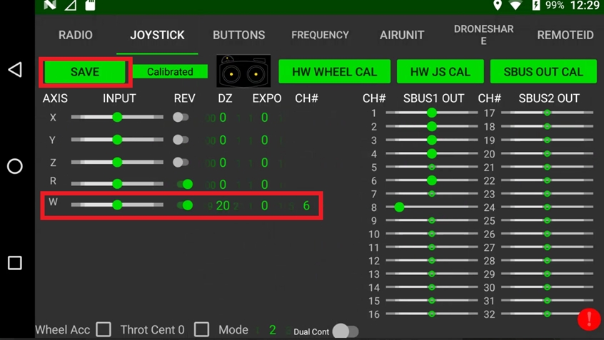 Go to the “JOYSTICK” tab and assign the wheel (W) channel to channel 6, with a deadzone of 20, and reverse the channel, then click “SAVE”.