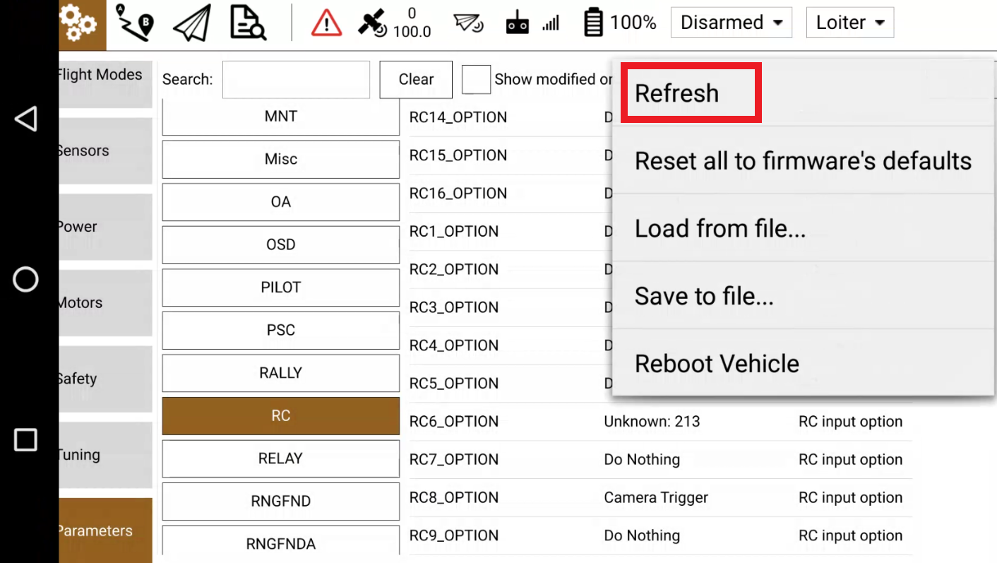 Click the “Tools” button in the top right corner, and select “Refresh”, then wait for the parameters to refresh. It is recommended to go back into the fly view (paper airplane icon) then back to the Parameters tab before proceeding.