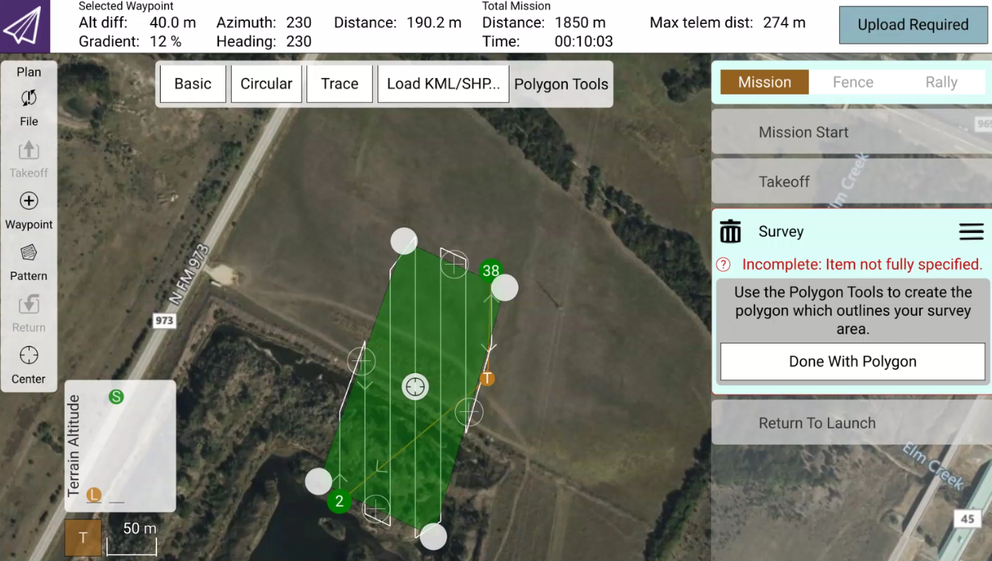 Click the Survey tab on the right and then click “Basic” for the polygon type. Drag the polygon edges around to cover the region you want to scan. You can add polygon corners by clicking the “+” icon between existing polygon corners. Once you have established your polygon shape, click “Done With Polygon”.