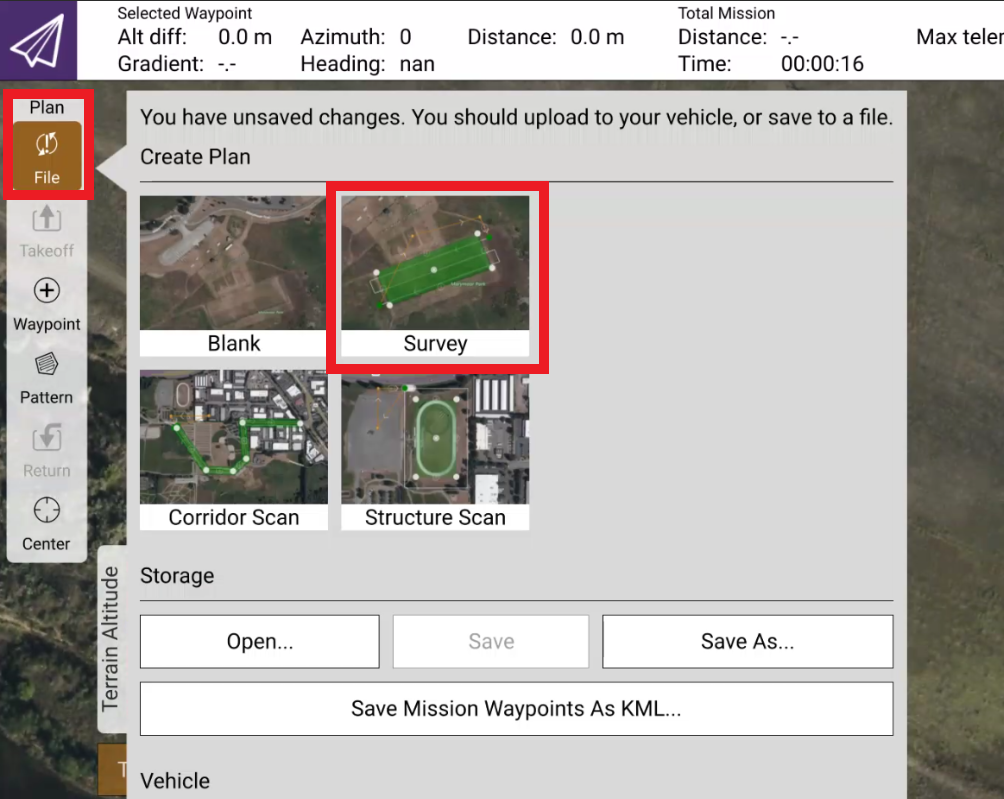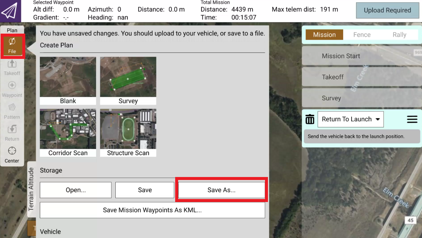 If you want to save this flight plan for later (it is saved on the Herelink - or the PC if you are planning on the PC), click the “File” button and click “Save As”