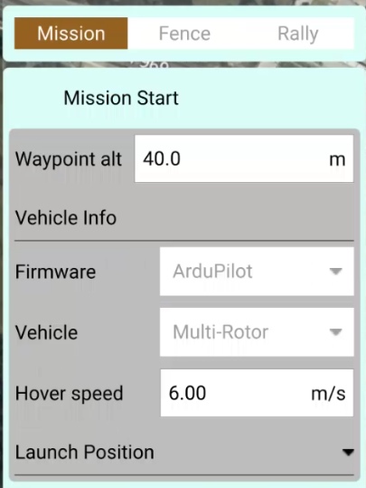 On the “Mission Start” tab, set your desired waypoint altitude (AGL) and your estimated hover speed for the mission (this can be changed later on).