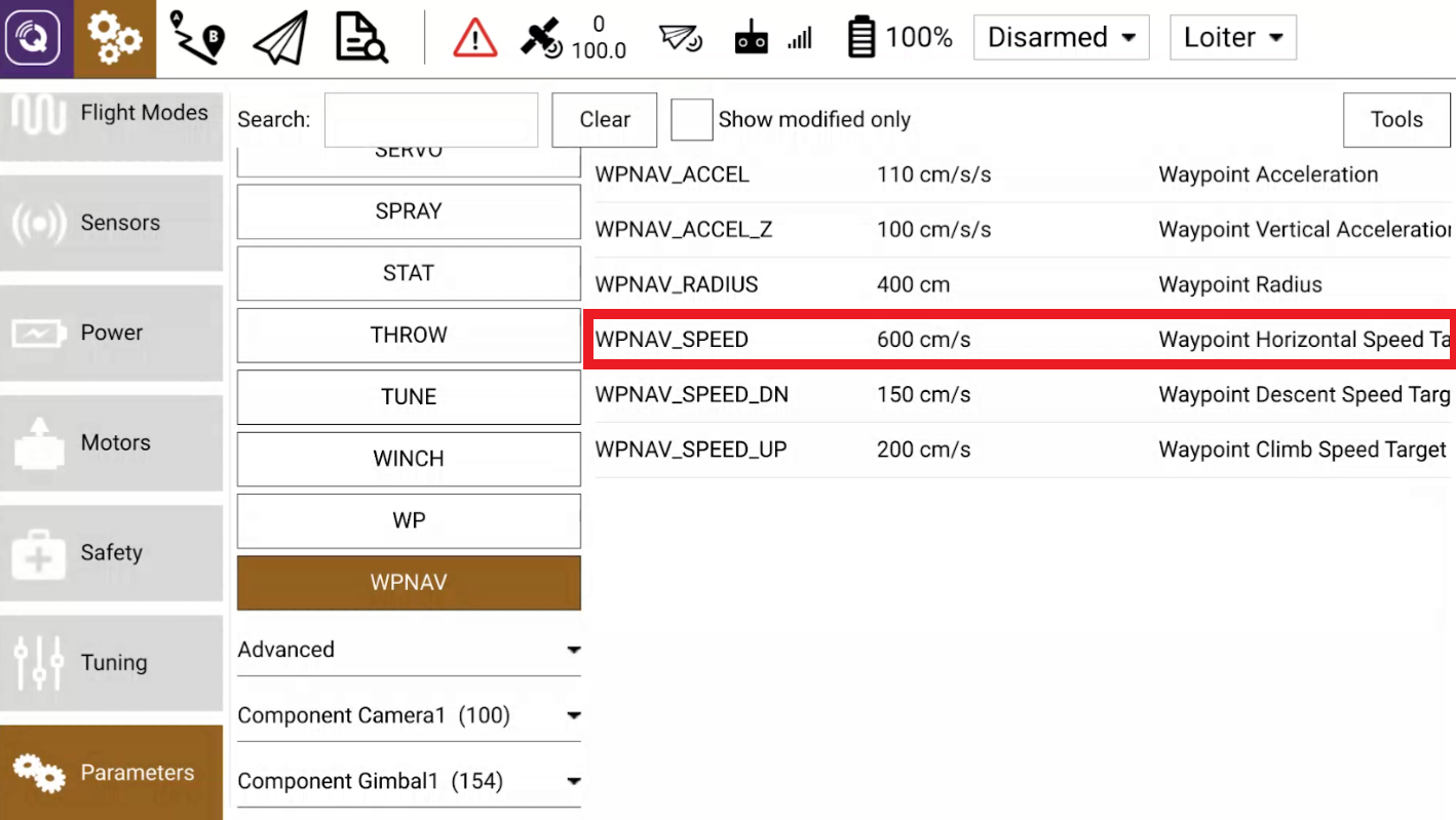 For whatever speed you set in the mission plan, you should accordingly adjust the WPNAV_SPEED parameter to be the same. For example, in the above case we used 6 meters per second as our mission speed. Here, we want to set the speed to match that, but it will be in cm/s. Simply multiply the flight speed by 100. Set this parameter and click “Save”.