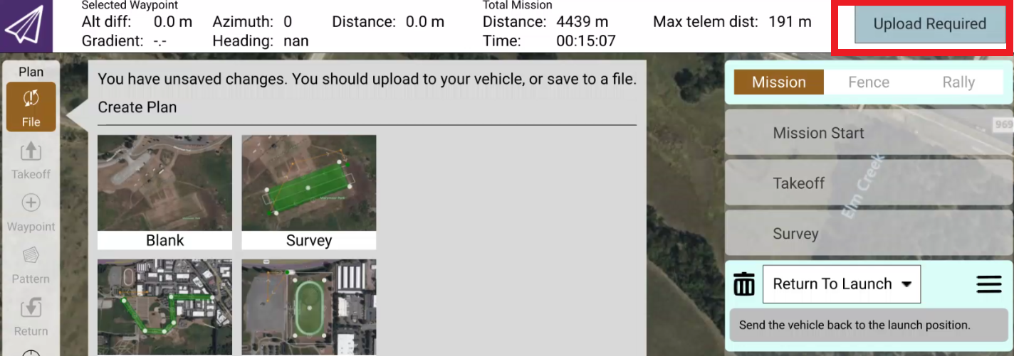 Once you are ready to use the mission on the X55, you will have to upload the mission. The X55 will have to be powered on and the Herelink will have to be connected first. When you are ready to upload the mission, click on the “Upload Required” button from within the mission planning tab.
